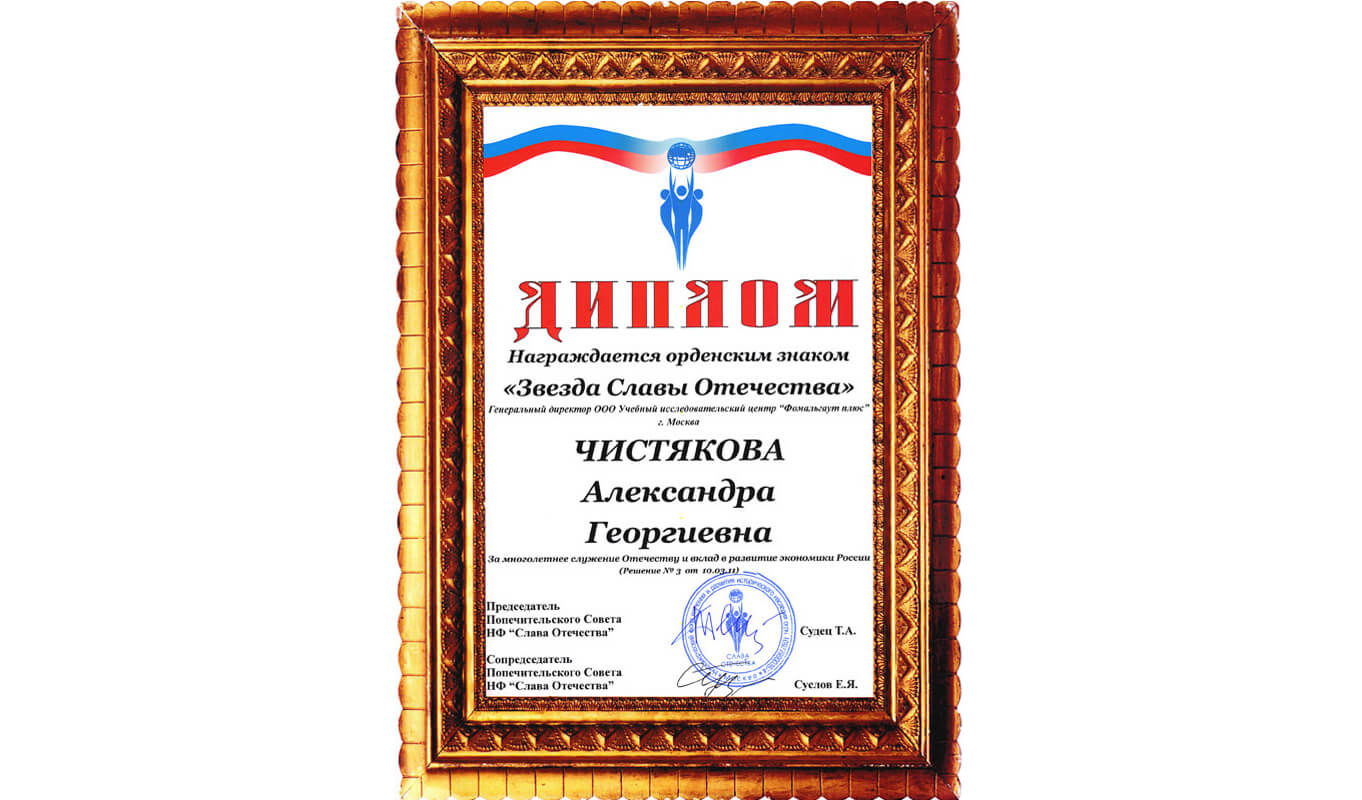 Попечительский совет Национального Фонда «Слава Отечества» высоко оценив вклад организации «Фомальгаут+» в сфере развития экономики региона, вынес решение номинировать Чистякову А.Г. на Высшую Общественную Награду - Орден «ЗВЕЗДА СЛАВЫ ОТЕЧЕСТВА». Наградой отмечаются граждане, руководители предприятий и организаций за высокие достижения в развитие экономики, национальной медицины, культуры, науки и спорта России. Награда была учреждена в 2004 году Попечительским советом Национального Фонда «Слава Отечества» и вручается под эгидой Фонда Храма Христа Спасителя.